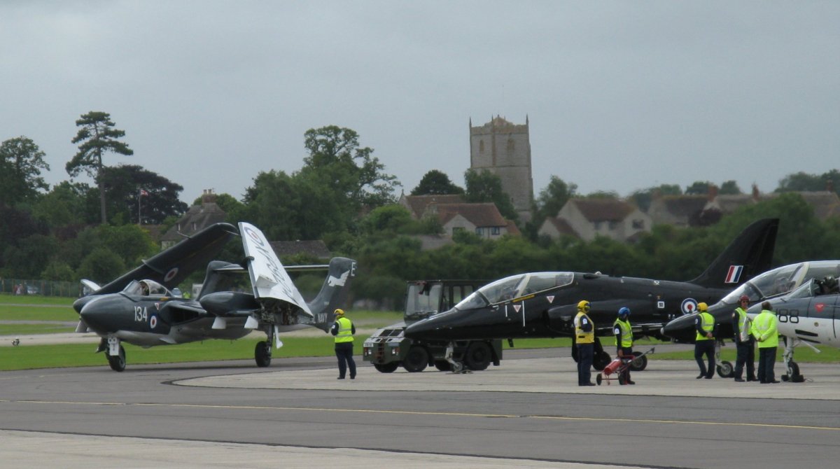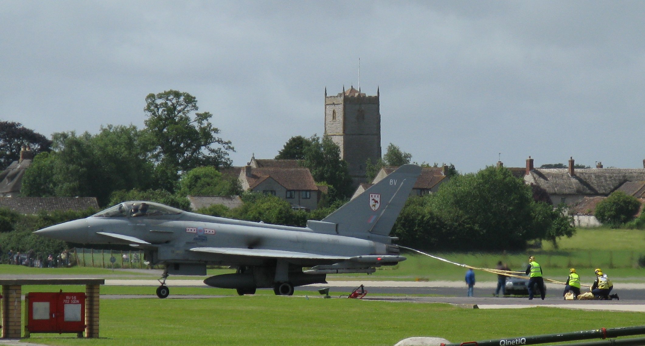 And now for something more recent...collecting up the parachute brakes on the Typhoon fighter just after landing. An interesting mix of new technology and old buildings - the Somerset church and thatched cottages. (Click picture for larger version.)