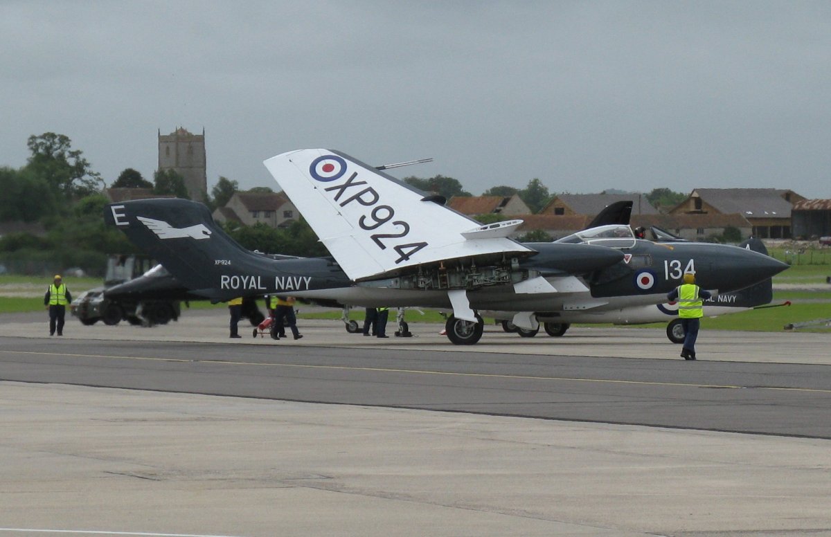 This De Havilland Sea Vixen is the only airworthy example in existence. The Sea Vixen was developed from The Sea Vampire and the first RNAS squadron of this aircraft was formed at Yeovilton in 1959. It served until 1972 although a few remained later as drones. The aircraft shown was originally an FAW.2 Sea Vixen and joined the Fleet Air Arm in 1964, serving with 899 Squadron At Yeovilton. It is now painted in exactly the same colours and squadron markings as when it served in 899 Squadron.