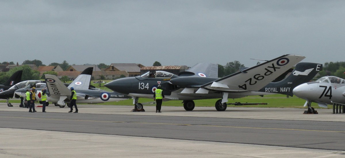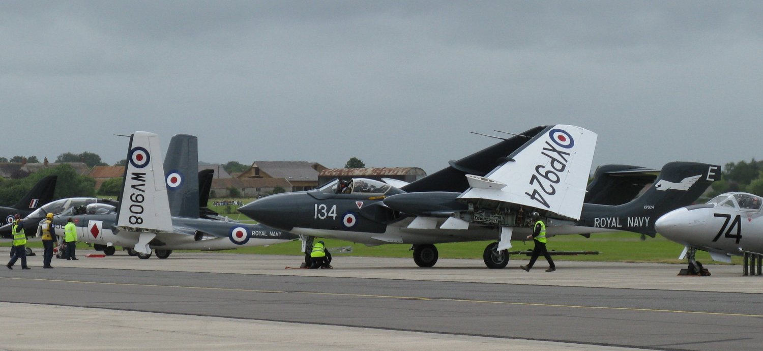 The following sequence of shots shows aircraft folding and unfolding their wings. I've made these pictures small but please click on the pictures to display bigger versions. The Sea Vixen (134) landed, taxied in then folded its wings (first two shots). The last three shots show the Vixen in front of a Sea Hawk which also begins to fold its wings. In the last shot both aircraft are unfolding their wings again. The nose of the other old aircraft (74) on the right in the last three shots is the Sea Vampire. 1.