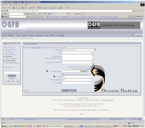 I clicked on Thornton then people. The window I then got was to enter my heading, description etc. I have a place to put and URL or a Thumbnail URL. The two buttons at the bottom show SUBMIT or RESET. But I can't get the BROWSE button.