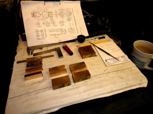 All valve blocks cut so they will fit in the steam chests. Steam chest face marked 'C' on the block side to make sure I keep them oriented correctly. Lots of checking of port sizes etc. to make sure I know what I'm doing. The blocks need to be milled to the correct size in the right places!