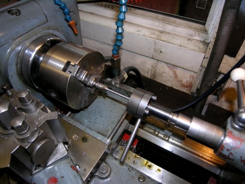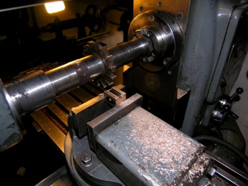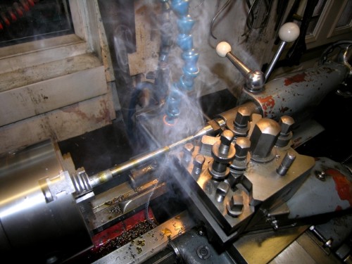 Cutting MS at high rates needs some coolant. I use neat cutting oil from a tank above the lathe and return it manually when the tank in the lathe bed is full. So, the flexible oil pipe fitted, a heavy cut relative to the size of the bar and away we go! This was a bit too heavy actually as you can see from the smoke! I went a bit steadier. I don't like to see the swarf turning blue as it peels off. Mind you, that never bothered Newton when he was doing big jobs. I once watched him making a heavy cut to true the tyre on a Black Five driving axle and the swarf was peeling off blue over his shoulder.