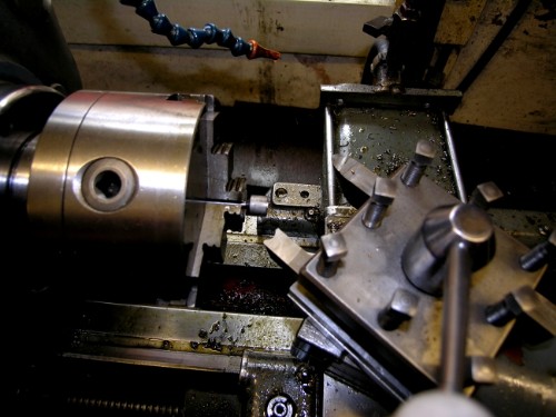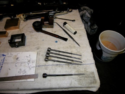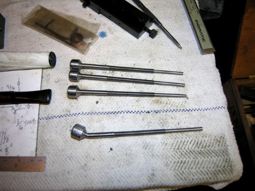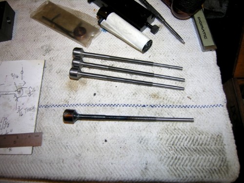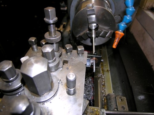 Four blank rods made. Form tool used for rounding the end before milling flat and drilling for the hardened pin to the eccentric rod. However, Form tools are tricky little beasts especially when the shank in the chuck is only 3/16".....