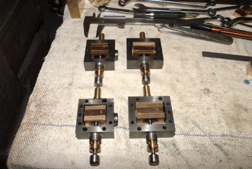 Close of play. All valve blocks square and sized, drilled 4.7mm clearance for the valve rod and the fit confirmed. All valves numbered to match steam chests. Next move is to fit driving blocks and then open the 4.7mm bore to an open topped slot so that the valve is not restrained in any way from seating on the face. Remember that the valve itself is loose and able to move independently of the rod and driving block, all they do is restrain it and keep it in the correct position. Last job will be to cut the steam passage in the lower face and grind the face to a frosted finish so it can seal on the port face.