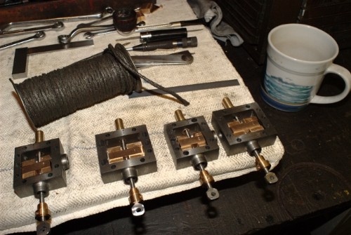 Final stage on the valves. About four inches of string cut off and separated into five strands, one strand for each gland. Pack them and screw them up. Ready for running. The steam chests can go back on the block now.