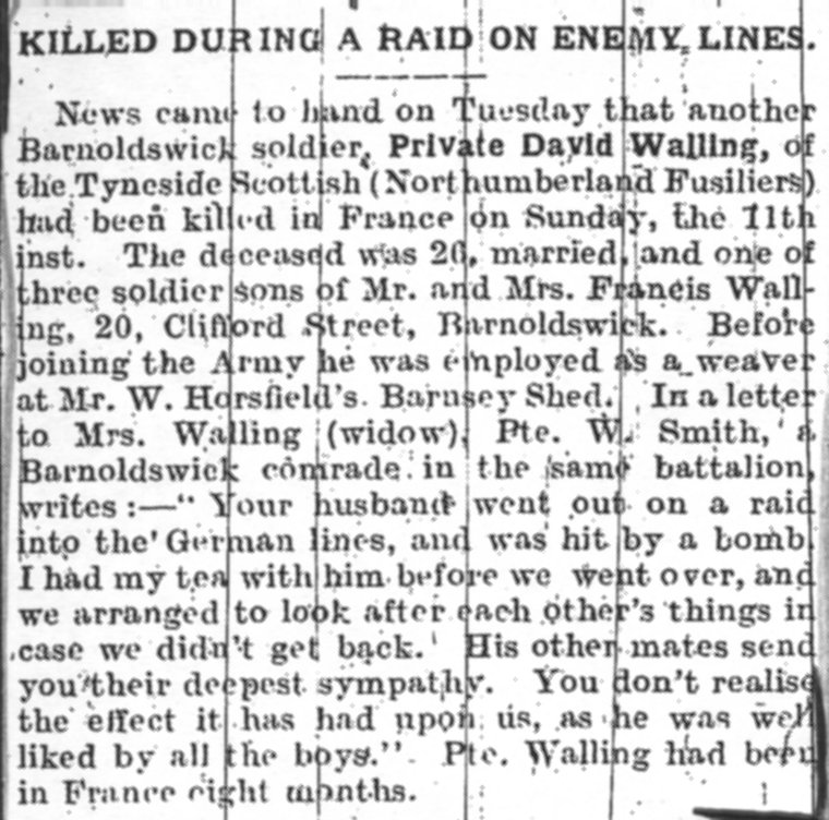 News came to hand on Tuesday that another Barnoldswick soldier, Private David Walling, of the Tyneside Scottish (Northumberland Fusiliers) had been killed in France on Sunday, the 11th inst. The deceased was 26, married, and one of three soldier sons of Mr. and Mrs. Francis Walling, 20, Clifford Street, Barnoldswick. Before joining the Army he was employed as a weaver at Mr. W, Horsfield's Barnsey Shed. In a letter to Mrs. walling (widow), Pte. W. Smith, a Barnoldswick comrade in the same battalion, writes:- "Your husband went out on a raid into the German lines, and was hit by a bomb. I had my tea with him before he went over, and we arranged to look after each other's things in case we didn't get back. His other mates send you their deepest sympathy. You don't realise the effect it has had upon us, as he was well liked by all the boys." Pte. Walling had been in France eight months.