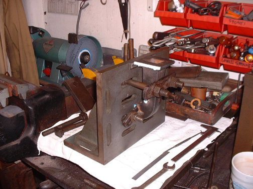 We started the day by having a good clean-up with the 5" angle grinder loaded with a wire brush. Plenty of muck flying round in the yard but it did the job. The rest of the day has been spent finishing the faces on the anvil and base and machining them to dimension. All they meed now is drilling for studs and holding down bolts. Then I attacked the awkward one, the standard. Apart from the fact it is a funny shape involving some fairly imaginative setting up, the faces, apart from needing to be square, are dimensionally quite critical. Slow work and up to now all done on the vertical miller. I did the face that holds the cylinder forst and I'm working from that. I'm erecting it just as you would do it if it was full size. As soon as I have the standard faced all round I shall mount the anvil and base on a temporary base block and fit the mouthpiece and the cylinder after I have machined them, then follow with the piston and rod and finish with the valve block and gear.