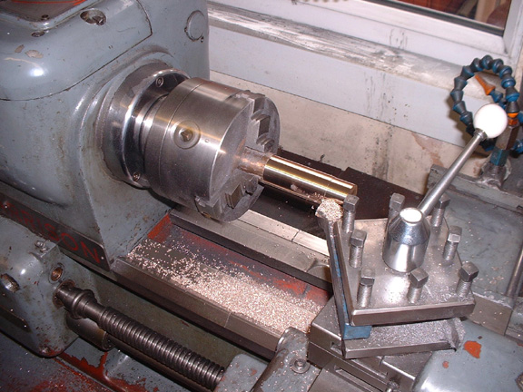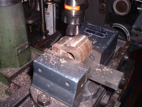 I finished drilling the lids and steam chests today including the 1/2" 26tpi stab-in for the steam pipes. Then I decided that this was a good time to make the valve rod guides. So, here's another riser getting trued up ready for some brass turning....