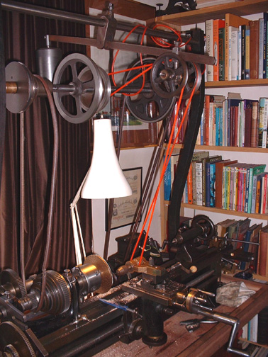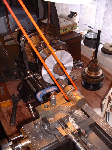 Alright, I got the number of segments wrong but the 20 hole circle will come in handy one day and I have enough room to get the 19 hole circle in so I shall repeat the procedure this morning. Here's the 1927 lathe demonstrating how handy a good overhead gear can be. Once you have set it up it's dead simple. The small clamp is a temporary traverse stop. I shall make a proper permanent one with a fine thread on the stop.