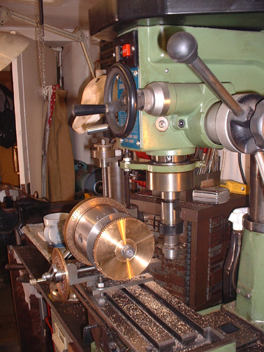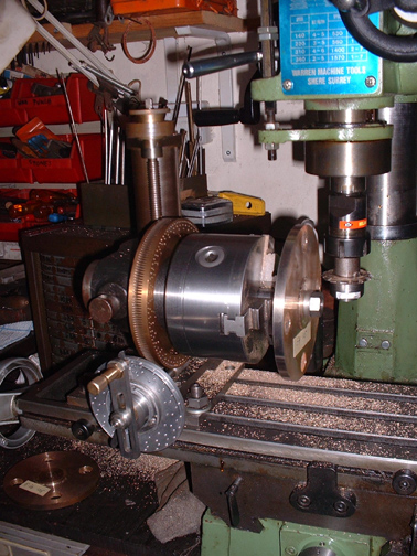 This looks wonderfully professional but is actually a picture of a cock-up caused by not thinking straight. This should have been a 95 tooth gear.... When I finished it I found I had 98 and a half teeth! I went back and checked everything and found out I had miscounted the holes in the 19 circle on the division plate. I had been counting 16 instead of 17. Ah well..... So I banged it in the lathe and re-cut it as a 90 tooth gear, nothing wasted apart from a bit of time and metal. Must count more carefully........