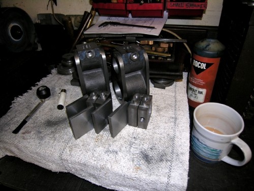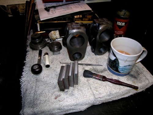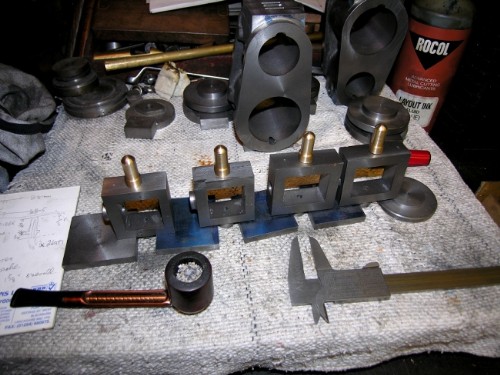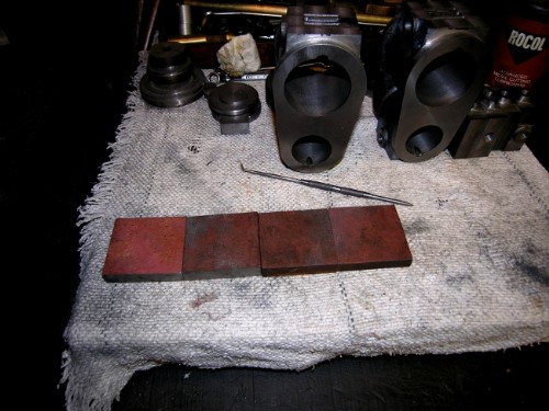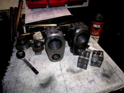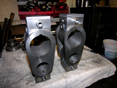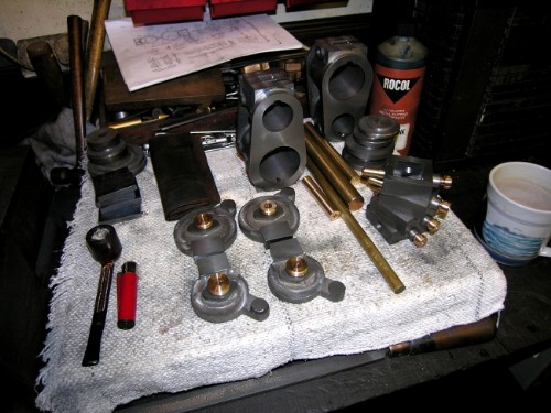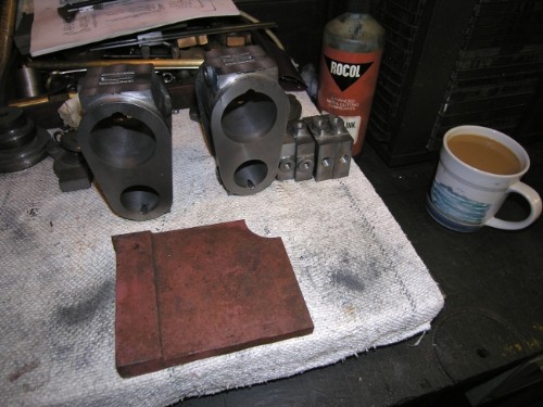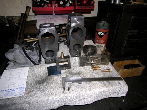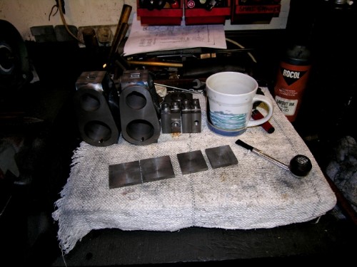 Close of play yesterday. All steam chests drilled and tapped for blind guides and gland nuts. I shall find some CI for the lids today and perhaps make some nice brass guides and gland nuts to keep Robert happy! Then sudding for lids etc. I never look forward to this bit. Must decide on number and position of studs. One point to note when that happens is that the basic error is positioning stud holes where they will break into steam passages! . Just as well to give it some thought because by now the castings are riddled with holes.