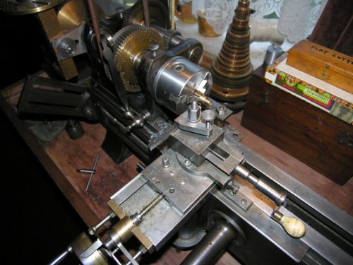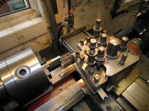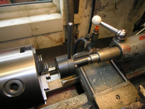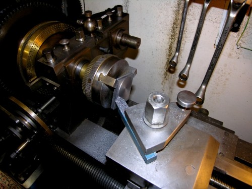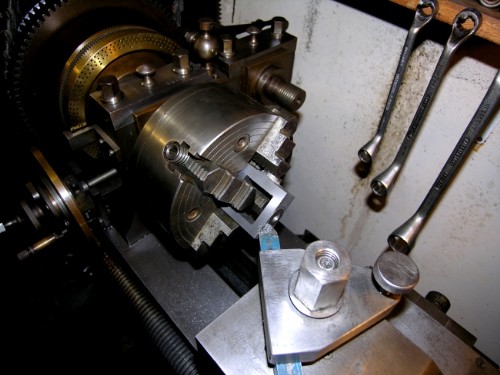 I wanted a tiddly little undercut between the thread and the flange and Johnny's 1927 lathe in the front room was just the ticket. Johnny wanted a Birch OT lathe just after he got married but couldn't afford one so he made his own! Can you wonder why I want to be his shadow when I grow up? For years this lathe was Newton's small lathe used in conjunction with the Lttle John he bought for the heavier stuff whan he moved into the small shed at Damside. Thanks to the generosity of a local family who knew how important it was I got it for a ridiculously low price because they wanted it to be refurbished, used and stay in the town. Youll see more of this lathe when we get to dividing for drilling holes.....