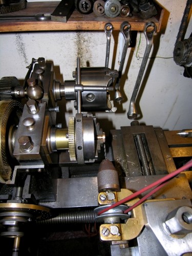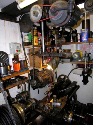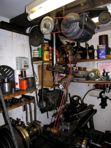 Robert, not nosey at all. If you mean the new setup and rethink pic: The large motor on the wall in the background is Johnny's original 1hp single phase Horace Green motor that was rewound free for me by the firm in Nelson because they liked it so much. A Modern motor of that weight would be over 5hp. It's driving the layshaft that in turn carries the matching stepped pulley for the lathe headstock. Including using back gearing I can run at 16rpm to 1128rpm. The motor on the ceiling is the Mardrive independent overhead drive unit. Unlike the normal setup for overhead drives this means you can drive both the lathe and any accessory in the toolpost independently. Say for milling a spiral grove in a workpiece. It makes the lathe far more flxible than a standard CG lathe. Only useful for light work like the medallion machine but still a handy tool whenever you need the headstock to revolve and control another operation at the same time.