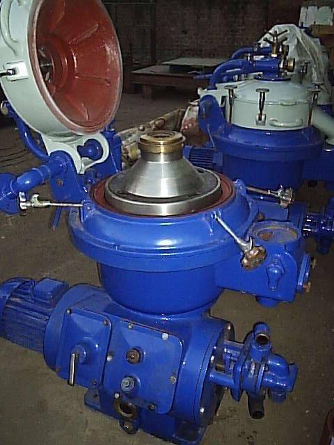 This is done by the use of a purifier as shown above. Basically it is a centrifugal pump that rotates at extremely fast speeds. These machines are semi hemetic (air tight). The disc pans spin at a tremendous rate of knots, and when the oil is allowed into the purifier via the inlet valve the centifugal force spins it with an outward motion. The heavier particles or sludge is trapped in the disc pans or hurtles against the side of the purifier bowl. It is the same principle as gravity settled sludge except the purifier is approx 100 times faster, and you have eradicated a sludge problem. The lube oil purifiers are cleaned every day. The fuel oil seperators can be left to run for a numer of days. I have had to run one for ten days at a time due to the fact that the backup purifier was not working due to bearing chatter, and the ship owners would not spend money on parts. Sad isnt it, everone wants to go to heaven, but nobody wants to die.