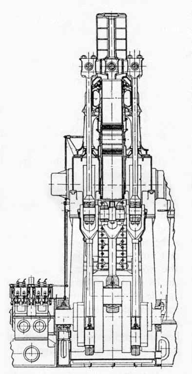 Doxford Opposed-Piston Main Propulsion Marine Engine. Side Sectional view of engine, showing Cylinder and Connecting Rods.
