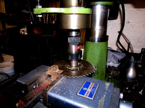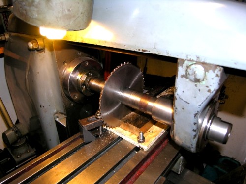 When I was cutting the gears for the change wheels on Johnny's 1927 lathe I made an arbor for the VM. Here it is with a thin slitting saw mounted on it. In case you're wondering why the gear cutter is still on it, the saw has no keyway, it relies on friction to hold it so it made sense to use the keyed gear cutter as the backing for the saw. Very sharp saw and it whistles through the brass. I did a few before I knocked off for the day. By the way, almost all my cutters were got out of scrap yards and secondhand machinery dealers. With the contraction of manufacturing industry it's amazing what was scrapped or came on the secondhand market. I saw a big (about 15 tons) Polish boring mill being scrapped at Dixons at Burnley at this time, no takers for it. Dixons cleared a Nu Swift factory and I bought about 2cwt of high speed steel for £25 one day. Newton asked me why I had done it and I pointed out the price of new Osborne HS stock, we had enough HS steel to last us for ever! If anyone is ever passing and wants a few pieces, call ijn, you're welcome!