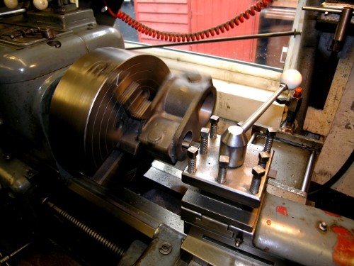 Meanwhile.... While the bore was on auto feed I started reducing the cruciform castings I have (God knows what they were for!) to make bearing caps for the bed. Might as well use these and have shiny caps. Never used in commercial proctice of course but with a small engine, plenty rigid enough. First job was to get two faces on each one.