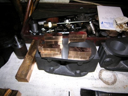 Today I shall finish the rough cutting of the bearing caps and get the bearing stock to size ready for work on them. Once they are done I'll do some more work on the cylinder blocks, machining sides and radii at each end and getting the steam chest faces finished. Then I'll clean up the bearing caps, make a jig for boring the stud hales on the beds,Drill the bed ready for tapping and then enlarge the holes in the jig and use it to drill the holes in the bearing caps. Iwon't get that done today but nowt wrong with thinking ahead.