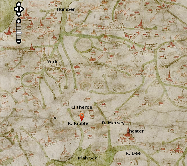 I tried putting Barnoldswick in the search box but nothing came up so then I put in Clitheroe and got success. I toggled out in order to see more of the area and found the River Ribble where it should be (just to the left - north - of Clitheroe), the Irish Sea at the bottom, York at the top, Chester and the rivers Mersey and Dee to the right. I've made a screenshot of the map and annotated it with these place names to give you a better idea of what it offers. Old place names on the map are few and difficult if not impossible for someone like me to read. The way I've identified places once I'd seen the relevant part of the map was to put my guess at the modern place name in the search box and see if it comes up with the same spot. So, after the Clitheroe map I put in York and it came up with the spot on the map that I had thought must be York.