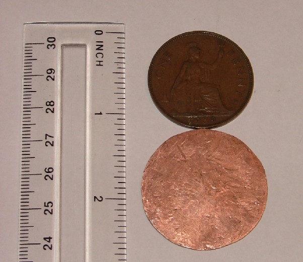 Been down to DT and found a nice short length of 1.75" square bar and a much bigger hammer than I've got at home, DT is at the far end of the school so I've brought them up to my office while I wait for the cable testing guy. I've bashed the first of my pennies up with my new found kit and it's turned out a treat, slightly oval, uniformly thick (about half the original) and perfectly flat, bodes well I think for a MkIII. Took less than 5 minutes, right tools for the job and all that....Getting better at this, I'll persevere until I get it just right.