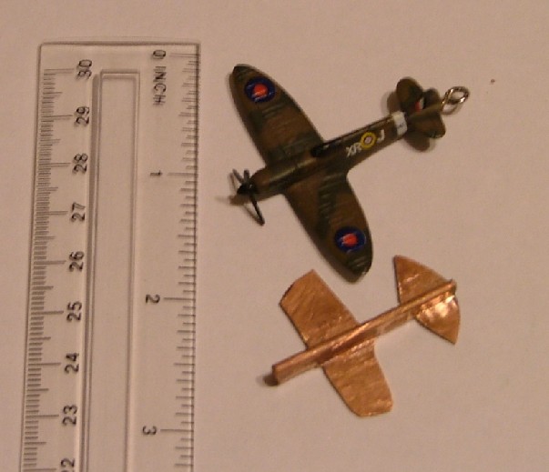 It took me about 3 hours to get to this stage, Steve got to here in an hour, but he is a metal basher by trade. More filing to do on the wings before I decide whether it's too long in the fuselage if that's the case I'll start again with a MkIII. I've promised Sally a sweetheart brooch for our 40's re-enacting so I'm determined to get this right. It's got to look like a proper Spitfire or it won't do. Can't do any more at this for a day or two as wer'e of to my Niece's wedding at the weekend. So far, this effort has been considerably easier than my first go, I'm gaining more experience as I go along. It might be better to work the initial beating of the Penny to an elipse to create more width for the wings, time and a bit more filing wil tell.