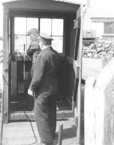 The ‘ground frame’ at the level crossing. The levers worked the cross-over, and the ‘train staff & key’ would have to be inserted into the frame before the levers could be operated. Nearest the camera is Ezra Fish. Can anyone identify the man behind him?. Other coaches were quite rare. I noted in my diary on Friday 5th May 1961, that a school trip to Rhyl had three new Mk.1 buck-eye coaches on the back of the 8:19 am train. The party arrived back at 9.37 Pm. On 27th June 1961, the annual specials for Skipton Gala brought a through train from Barnoldswick at 2.05 pm with nine coaches hauled by 42546. Special workings with the push-pull set returned the passengers at hourly intervals connecting with the Skipton-Colne trains. These, I noted, were three bogies and ran without a guard. 1 presume this was legitimate; I remember asking at the time and was told that because the train ran between two staffed stations, no guard was needed, the station-master giving the 'right away'. Any comment from readers?