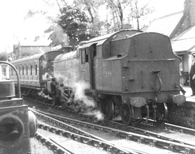 Having moved on to locomotives, it is clear that the other 'open-cab' rolling into the platform (without any lamps on the bunker, but one back-to-front just visible on the front buffer beam) is not 1347 as the top lamp bracket is lower down. I have enlarged the locomotive, but the angle is too acute to distinguish the numbers. Donald Binns states the branch was originally worked by an 0-4-2WT. The nickname for the local train was the 'Barlick Spud', or ‘spud-roaster'; my grandfather told me that the original locomotive was so small it looked like a portable contraption used by a local vendor to roast potatoes. Several photographs exist of Kirtley outside framed 0-6-0 NO. 2404 on the branch train with tender cab. 2F No. 3477 was seen in 1947, and later Skipton's 46442 and 46452 were regular performers on both passenger and coal trains. 0-4-4 No. 41904 spent a short time on the branch around 1950, and the older Johnson 0-4-4Ts were regular engines for decades. In addition to the two mentioned already in Midland Record, 1275, 1277, 1358 and 1366 were used in LMS days, and 58040, 58075 and 58077 in BR days. Ivatt 2-6-2Ts arrived brand new in 1951 and 41325/6/7 and 41273 were regular performers. Later 8401/5/7/28 took over. Less frequent were Derby 4s, the occasional Ivatt 4 and, on successive days towards the end when the morning train had become a Holbeck working, Jubilee No. 5658 Keyes (on a foggy day and I didn't have my camera), and immaculate ex-works No. 42394 in bright sun, which I duly photographed in colour. At that time this was one of my favourites, only two Fowler 2-6-4Ts then remained, and with five well-kept compartment coaches, this was Derby's swan-song. The other was No. 42145, filthy, leaking steam with thirteen patches on the side tanks. But at least the 2-6-2Ts worked the Saturday train, and thus there was dignity with the last train on September 1965.