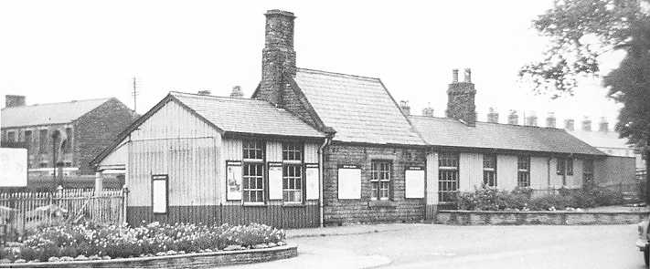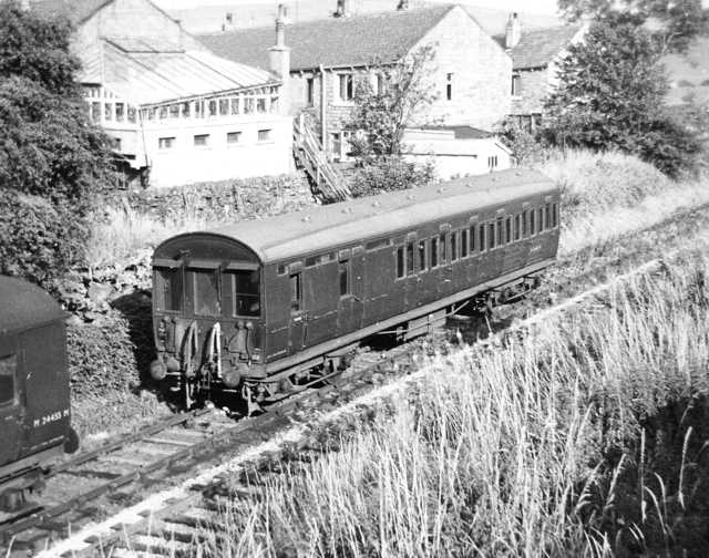 Barnoldswick station from the road. The coach in the background was one of many awaiting scrapping in the wake of Beeching and dieselisation.