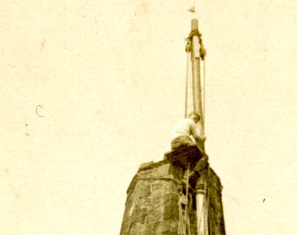 Stanley, it's a postcard from 1925. the place is Chelsea Massachusetts USA. steeplejack working on spire of the Universalist church. he's lowing stone down to ground level. with a STICK.