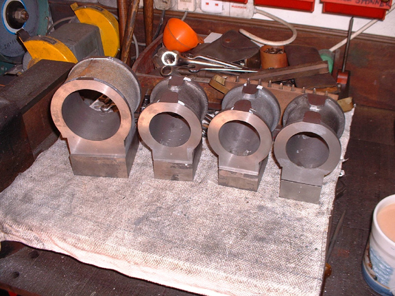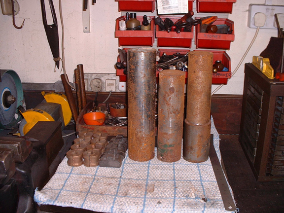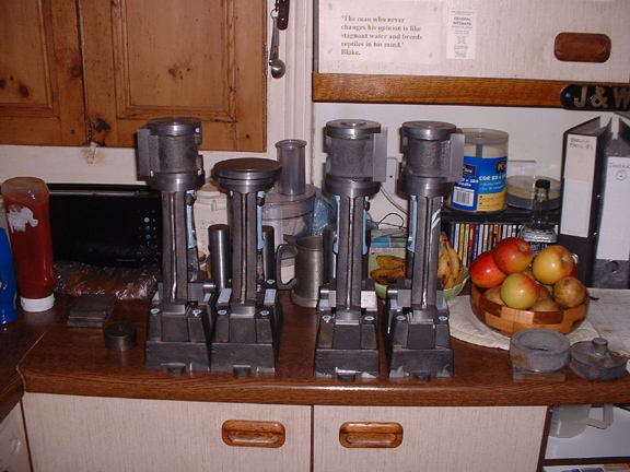 A clean tablecloth and a root through the drawers and the stockpile. All the bronze castings are there for the main bearings, eight sets in all. Eight CI pedestal caps which need cleaning up and sizing before being fitted to the sole plate ready for boring. The serious lumps are for the crankshafts. In order to make the crankshafts complete with balance weights we need 3" bar. The piece on the left is 3" and long enough to make the crankshaft for the compound. The other two pieces will come out at 2 3/4" but I can get the shafts for the smaller engines out of them with smaller counterweights. I've never been convinced that the counerweights do much good in practice, I've never seen them on a normal mill engine. I'll cut the lumps down to the right size for the small engines, about 9" long and then I'll be ready for some serious turning.....
