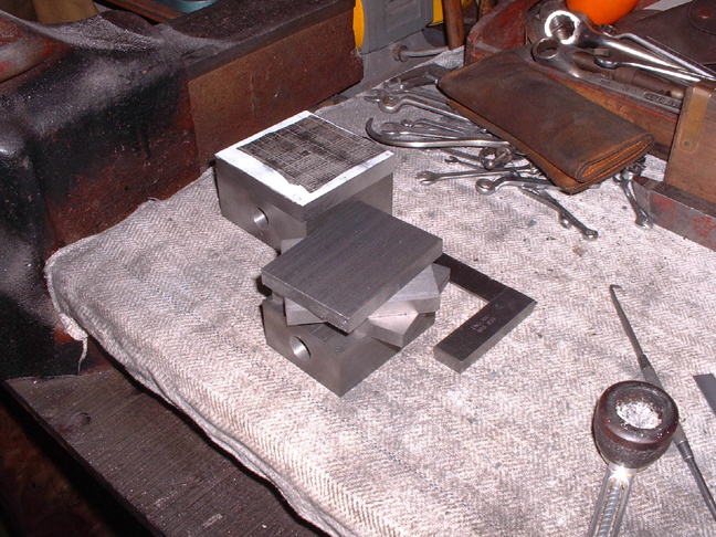 I had me clean-up. Here's a sight you don't often see in my pics, the surface plate on the bench. I got it cheap when Tommy Rbinsons sold out in Rochdale and it's brilliant for fitting on. I'm not too bothered about the accuracy, it's near enough for me. Another thing worth mentioning is the bench. Made out of 2" mahogany boards on a dead solid fram and fastened to the wall and the floor. Not a lot of point having a six inch vise mounted on something that won't stand it! I had a vacuum round and cleaned up most of the CI dust and chippings and even washed the wipers and hung them outside to dry....