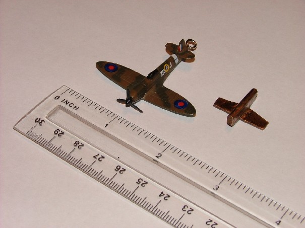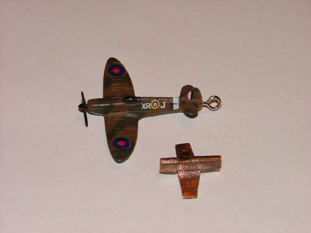 The heating and quenching helped a bit Stanley, finaly got one bent exactly across the diameter, total cost so far 8d, I cheated a bit and sawed a groove on the diameter to help the bend. The old pennies are a Cupro Nickel mix, the Nickel adds to the hardness to give extra wear capabilities to the coin. Even after heating it's pretty hard but no signs of fatigue along the bend so it obviously helped. I've progressed a fair way now and not taken any pictures. Made the fuselage and basic wing shape using a screwdriver and quite a bit of belting with a hammer with the fuselage gripped in the vice, bending the wings back down. Iv'e cut out the basic shape of the fuselage and the profile of the wings leaving plenty of spare metal to create the eliptical wings. The problem is going to be the elevators and rudder, they are set a quite a high incidence, almost at the top of the fuselage, I might be able to hammer the rudder out of the metal of the fuselage, but I think I will have to solder the tailplane in place. I'm working using rack of the eye from a small diecast spitfire model which was originally on a keyring, it has a wingspan of about 1.5". The maximum size you can get making one from an old penny is about half that. I'll do a side by side picture of the diecast and my efforts so far tomorrow. I need my little fine ratty files now, in my toolbox at work so I can pick them up tomorrow. I'm quite enjoying this, I'm going to turn it into a "sweetheart brooch" for Sally when we're doing the 40's stuff. Malcolm said that the trick was to leave the date on the finished plane, can't see how this can be done using a single penny for the plane. Does'nt matter which way you bend it, you're bound to end up cutting it off. The only possible way would be over the nose of the plane but there is'nt enough metal involved to preserve the date field of the original coin. Unless I'm doing something wrong!
