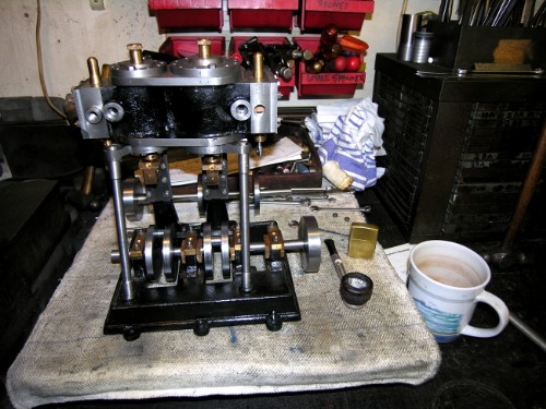 What I want to do now is set the engines up so I can drive them via the shaft end and run the bearings in. I can turn the shafts, just, at the moment but it will make fitting the con rods and valve rods much easier if the shaft is run in and can be turned easily. I'm letting my mind wander round this at the moment. I fancy holding the shaft end in the chuck on Johnny's big lathe and packing the engine up on the lathe so I can drive the shaft easily. Some running and oil with lapping paste in should do the trick!