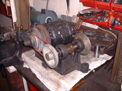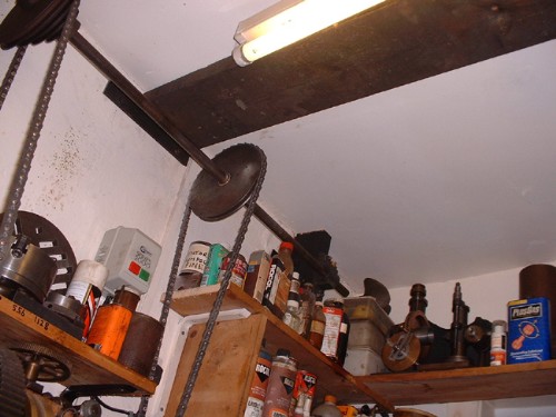 It'sa time I did something about the overhead drive for the 1950 lathe. Here's the rig up for the tension arm and the pulleys.