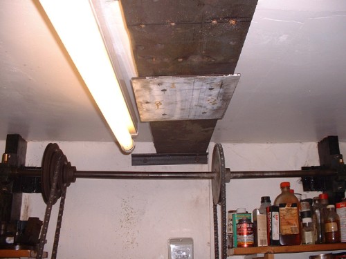 By 4pm the plate is finished and fastened onto the beam. All I need to do now is find someone daft enough to hold it up for me while I pop the bolts in. Luckily there's a big young lad called Ringo lives nearby........ Watch this space. Oh, and before you say anything, you're right it's not straight and level. Neither is the ceiling, but it doesn't have to be perfect as apart from the cord drive, it doesn't have to have any relationship with the lathe as long as the unit is in roughly the right place. Good job actually......