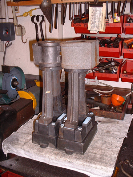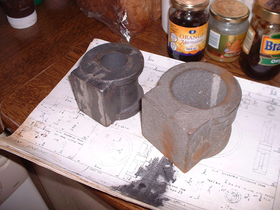You may remember me mentioning once that I told Newton that the 2 1/4 inch bore cylinder looked a bit small on the engine and he agreed with me. He made a pattern and got castings made for a 3 1/4 bore Cylinder the same stroke (2") as the original. He had a set of castings made for me at the same time and I stowed them away in the old oak chest. So.... we can make it really interesting and fit the bigger cylinder to one of the engines. Not as big a modification as it looks because the only alteration to the basic design is the foundation ring for the actual cylinder and a bit more overhang on the crankshaft because the eccentric will be further away from the centre line. The difference in the bore makes a big change to the power. The standard cylinder gives about one and a half horsepower but the larger one will give much more. The area of the standard piston is 1.23 sqare inches, the larger one is 4 square inches so in theory this will give three times the power. Newton made quite a few engines with the larger cylinder and they seemed to perform OK. Problem is I don't know whether he beefed the crankshaft up. I'll have to give that a bit of thought. Plenty of muck shifting to do before we get there! First thing to do is clean all the castings up, get them machined to size with square faces.