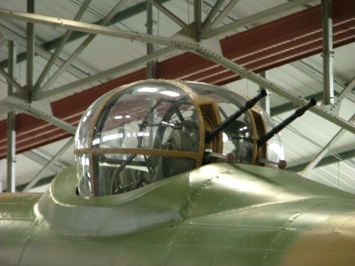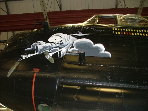 Front Starboard showing inboard port and Starboard engines and props, Upper Front Gun Turret, Bomb Aimers sighting position in the nose and massive bomb bay. The covers on the tyres are to protect from oil spills.