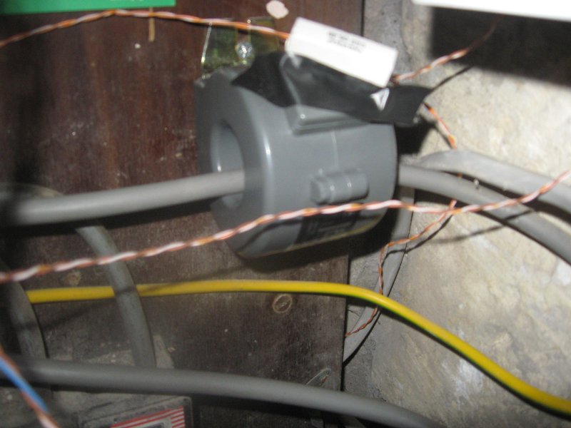 The 'Ebay' current transformer on the meter 'tail' cable. The white thing on top is a large resistor (the burden resistor) The small wires are signal wires running to various sensors in the meter cupboard.