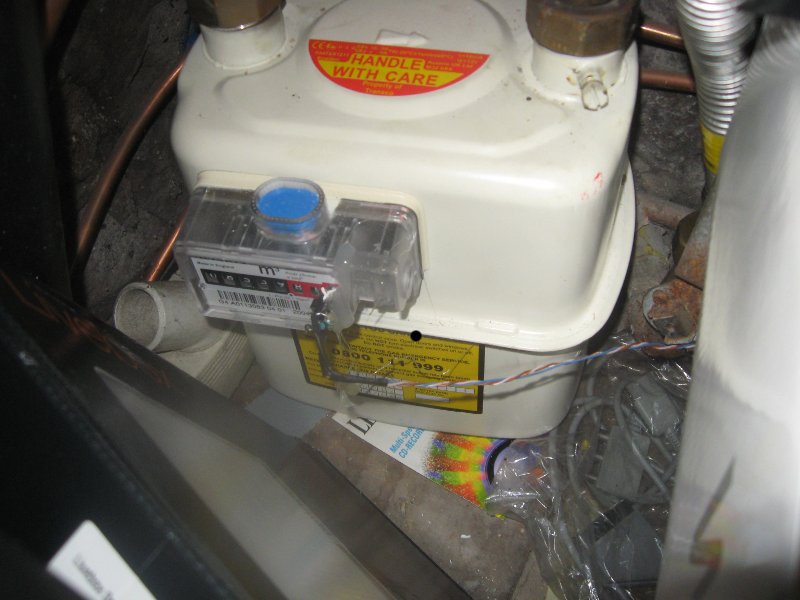 The next step was using the same technology on the Gas meter. Its an 'odometer' type meter but the last digit (1000ths of a cubic metre) has a silvered bit in the centre of the '0'. It just times how long it takes to rotate and works out a figure for wattage. This can only be approximate as there are two unknowns when it comes to calculating your bill (which is in kwh, the same as electric), one is the 'conversion factor' which corrects for the temperature of the gas (cold gas is denser and thus has more energy than warm gas) and the actual energy content of the gas (Mj / m3) which varies on where it comes from and its impurities. I use some figures I pulled off my last gas bill. It works in fairly large steps as the meter only revolves fairly slowly and I don't get more than 3 or 4 revs in a minute. It stops altogether on a frequent basis (unlike the electric meter which thanks to the stuff that runs all the time, never stops.) It has no way of knowing whats happening between the pickup point on the meter, but it does accurately track gas usage over time. If say its 15 minutes for a revolution of the meter, it could be say the hot water being turned on for a few seconds and the combi boiler firing for a short time or a gas ring on low for the whole quarter hour.