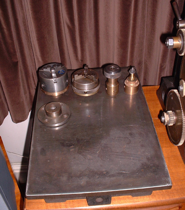 The surface plate is one that I gave Newton about twenty years ago when I won two from Tommy Robinson's sale in Rochdale. I kept the 18"X24", this one is 12"X18", handy things to have around. Yhe lathe came with the Polish chuck of the left, in my treasures I found a Burnerd 3 jaw, a pin chuck, the pillar chuck for gear-cutting, you can see that it's been used for cutting a small gear and the cutter has overun into the body, quite intentional. In front is a chuck back which I'll have to find a four-jaw for..... All these were made for this lathe (3/4 inch Whitworth thread) and turned on it so they are dead central with the spindle. Onward and upward! I'm giving a lot of thought to driving it........