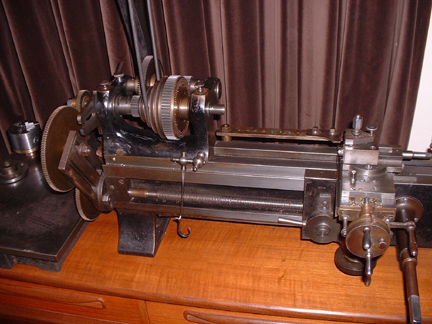 No Robert, see above. Johnny Pickles 1927 half size copy of a Birch Lathe from Manchester. Unique design, saddle is mounted on the front of the bed so you can have rise and fall on the slide rest tool holder. Dividing head in the headstock gearing. Very heavy bed for the spindle size made them very accurate. I've found more bits that fit it including a taper turning attachment for the back which can be fitted with shaped templates for turning curvilinear shapes. More about this later.