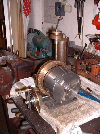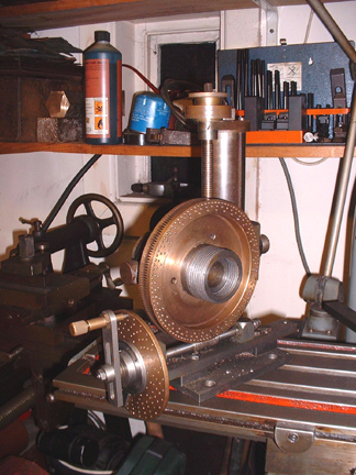 Now you can see what I have been on about.... The new bush is fitted and now I can use any of the chucks from the Harrison L5a on the dividing head for work holding. Imagine a bar of metal in the chuck (a mandrel) with a blank gear mounted on it. Dead easy to cut any number of teeth on it. The clockmaker's friend Andy! Big enough to cut gears for a turret clock as well. Now, where are my drawings of the clock in the Houses of Parliament.......
