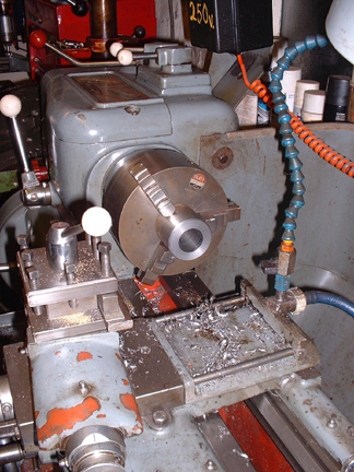 This tale comes under 'mugs for luck' I think..... There was nothing on TV last night so I went into the workshop to make a bit of muck. I decided to make a screwed bush for the Pickles dividing head that would accept chucks from the Harrison L5A lathe. First job was to take the original fitting off, measure up and identify the threads. No problem, my new bush needed to be threaded for inch and three quarters 8 threads per inch internal and two and a quarter at 6TPI external. So I sliced a piece of 2" stock off, banged it in the lathe and bored it.....