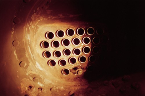 It is a big firebox and used to be fed by a conveyor arrangement carrying loose straw which fired just about instantaneously when it entered the box. You can always tell a strawburner or a woodburner because they have a hole through the firebox wall on the level of the tube plate protected with a cover. You could open the cover and shove an iron rod or stick in and rattle it across the tube plate to knock the bird's nests off. By the way, these were of course bits of charred straw that had lodged on the tube opening. Called bird's nests for obvious reasons.