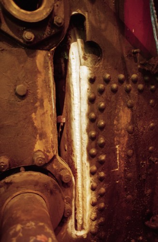 Here's the completed weld having a dye penetration test and ready for ultrasonic and magnetic flux NDT. Perfect repair. Weld the section of the horn plate back in, replace the wheels and gearing and then hydraulic test to ten year standard. Just shows what can be done by men who have the skills......