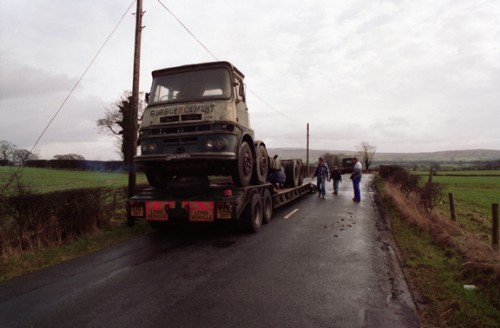 First thing to do was put a new battery on, attach the jump leads for insurance and then get the Gardner to cough....... Once started it was driven onto the low loader under its own steam....