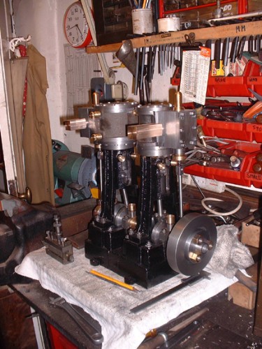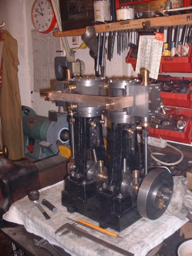 Well, I'm calling it finished. Lots more I could do to it but I had it running this afternoon on the little compressor which is a bit of a miracle. Doc is coming down tomorrow with the bigger compressor and we will be able to run it at some speed. It's not been the easiest day, I gave myself a fitter's nightmare with the 12 4BA setscrews in the flanges on the receiver. It all started very badly because I drilled the holes in the flanges and noticed that the centre dot I had put on to make sure I drilled everything template way (and which was correct on the manifolds) miraculously turned out to be 30 degrees out! Don't ask me how that happened. The only consequence was that the drain on the receiver isn't on the bottom but gaces in towards the centre of the engine, 30 degrees out of course. However, as it turned out, the drilling was accurate and after a lot of fiddling work I got the whole lot bolted in place by dinnertime. I've been running the engine since then on the little compressor with plenty of oil in the bores to free everything up and get a polish on the cylinder walls and the trunk slides. So that's it, I'm calling it finished. I started with some lumps of metal and made something that would drive a 20 foot hull. I'm not going to do any tittivating, Look forward to the next job. First thing after tomorrows running is to have a bloody good clean up!