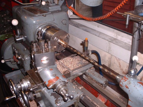 Of course we need a 3/8 hole through the receiver. I poked an ordinary 3/8 drill in for three inches at each end but of course this didn't cut it as the receiver is over 9 1/2" long. Normally this would mean finding a piece of silver steel and making a diamond point drill but it just so happened that in the drill drawer I had some long series drills I picked up somewhere along the line. It all goes to show, never walk past something thinking "I'll never use that". This drill has been sat there for about twenty years, just waiting......