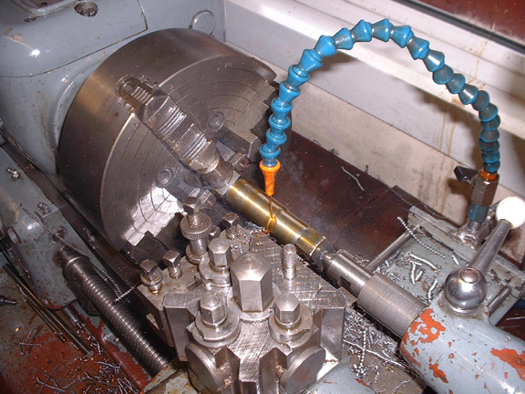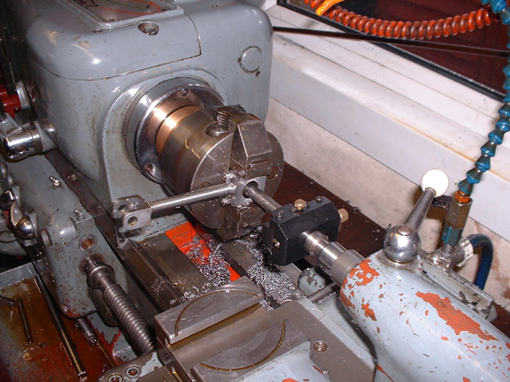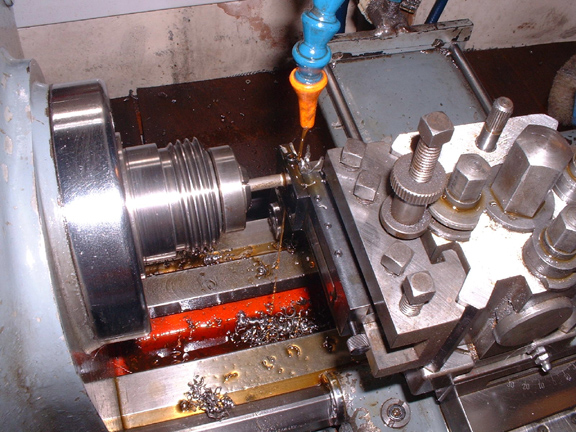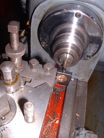 Here's a view from the tailstock side, the cutter has to be adjusted to the required diameter by trial and error. In this case 4.55mm for a 2BA thread.