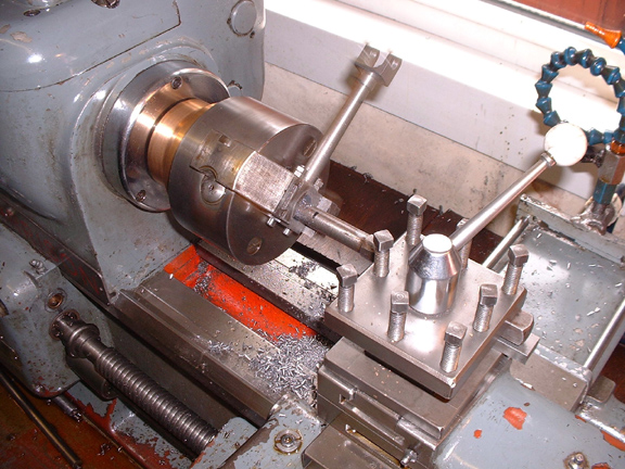 Once set up it's a doddle. Here we are on automatic feed reducing the rod down to the required size. I had the tailstock die box mounted and so just wound the fixture out of the way and ran the thread down on the lowest speed.